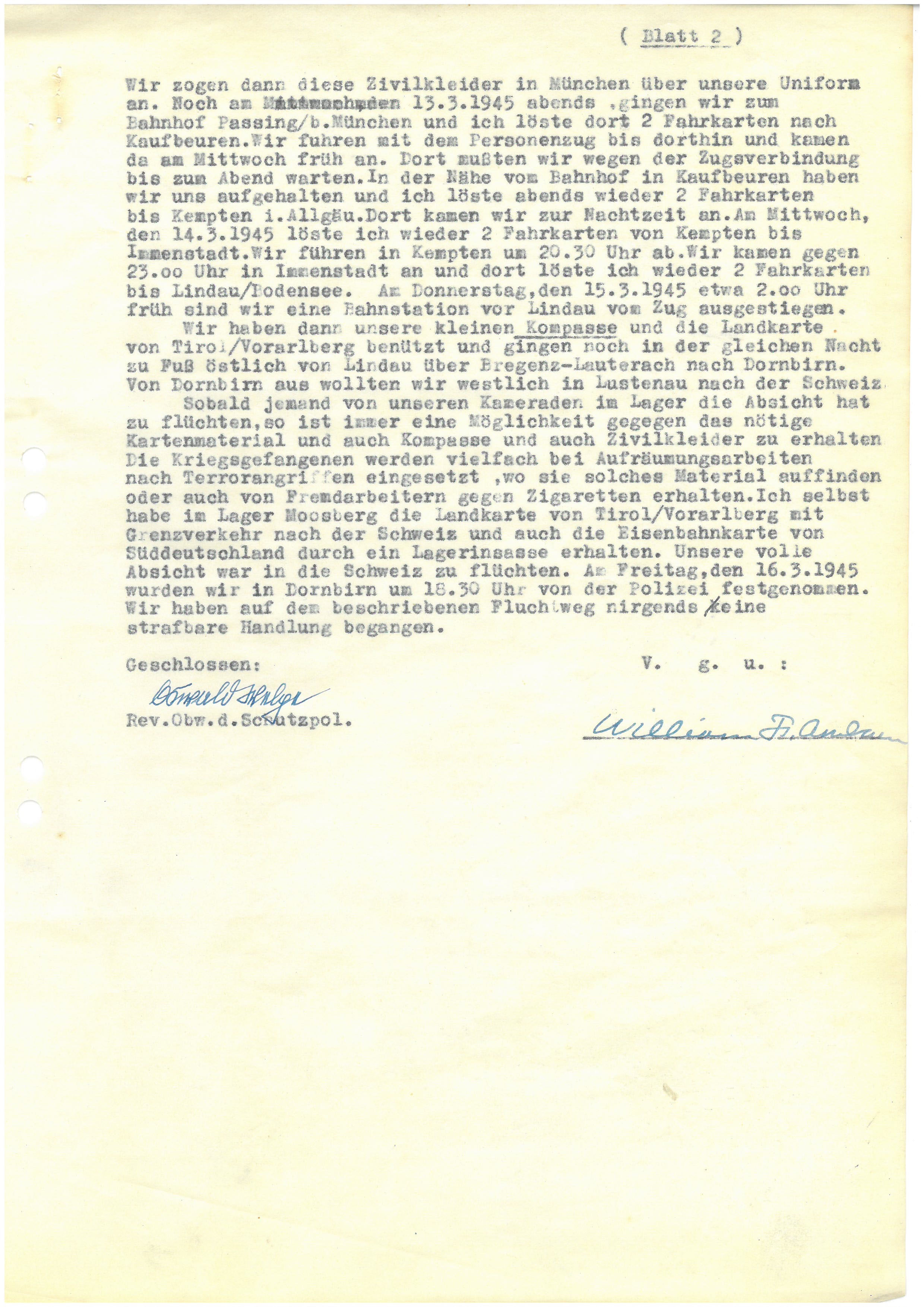 Polizeilich vorgeführt wird der festgenommene Kriegsgefangene William F. Amburn, geb. am 21.11.1921 in Maryville-Tennessee U.S.A., protestantisch, ledig, Landwirt. Ist angeblich am 13.3.1945 aus München, teilweise mit Bahn, teilweise zu Fuß aus dem Lager Moosberg (sic!)/nordöstlich München geflüchtet und wollte in die Schweiz. Genannter hatte eine Landkarte von Vorarlberg mit Grenzverkehr nach der Schweiz, dann 1 Eisenbahnkarte von Süddeutschland und 2 Fluchtskizzen bei sich und ist angeblich wegen Mangel an Lebensmittel geflüchtet. Er beherrscht die deutsche Sprache und seine Muttersprache ist Englisch.“[1]