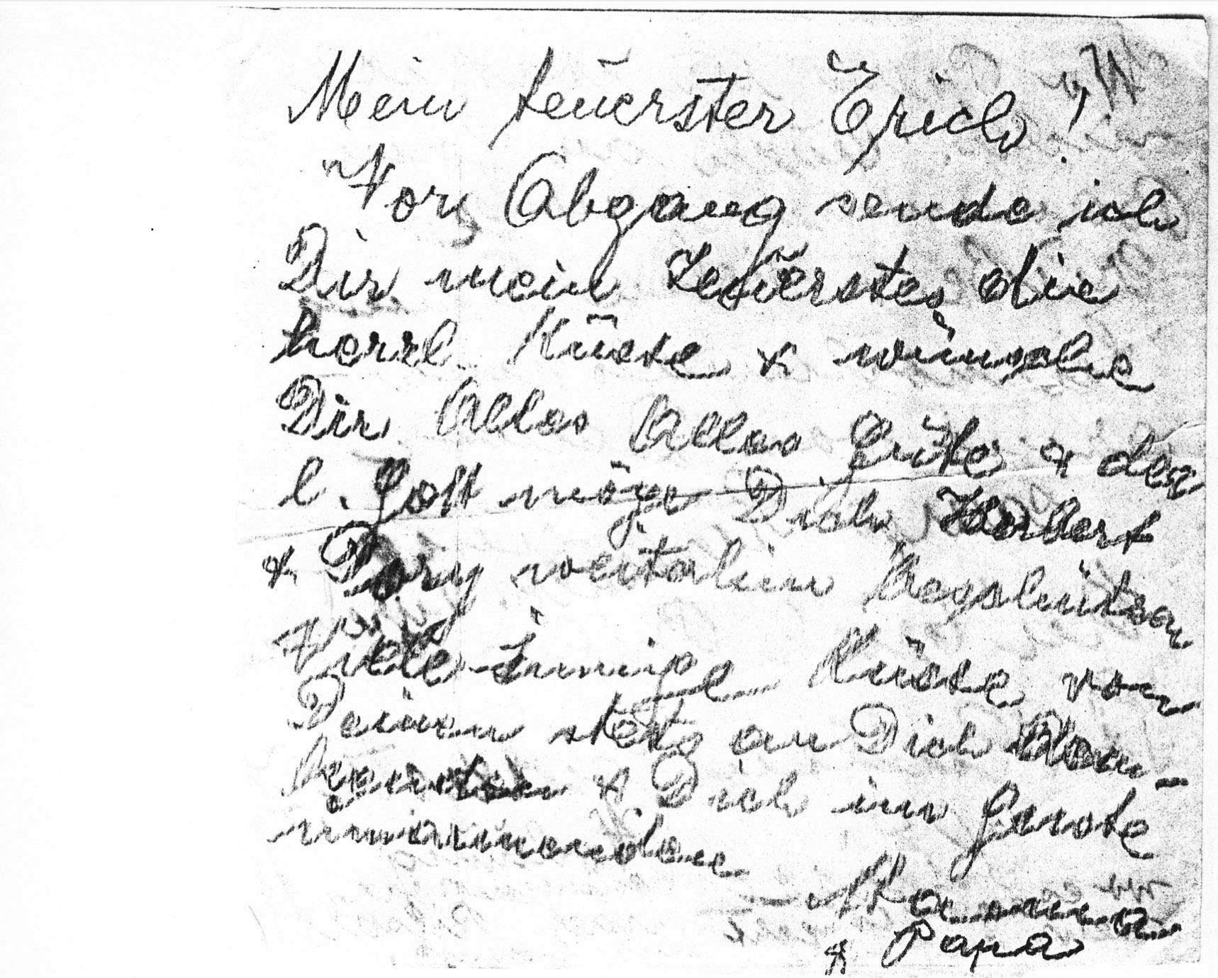 Vor Abgang send ich Dir mein teuerster die herzl(ichsten) Küsse + wünsche Dir Alles Alles Gute + der l(iebe) Gott möge Dich weiterhin beschützen. Viele innige Küsse von Deiner stets an Dich denken + Dich im Geiste umarmenden