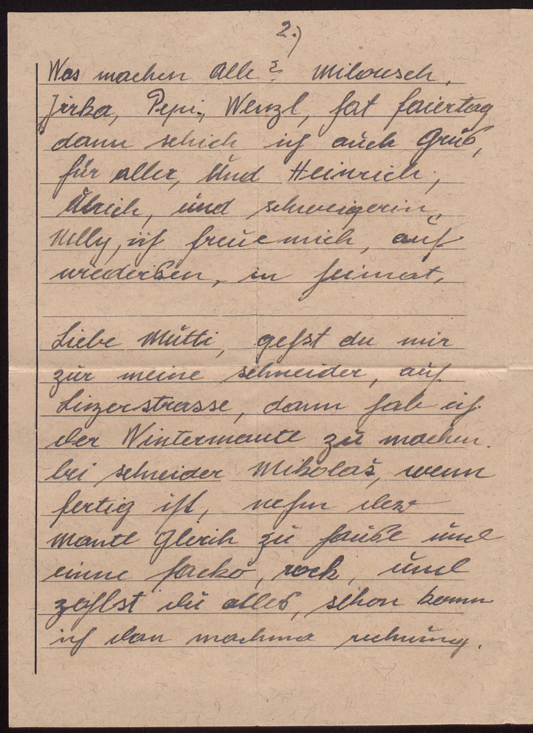 Liebe Mutti, gehst du mir zur meine schneider, auf Linzerstrasse, dann hab ich der Wintermantl zu machen bei schneider Mikolas, wenn fertig ist, nehm den mantl gleich zu hause und einen sacko, rock, und zahlst du alles, schon komm ich dan machma rechnung. […]