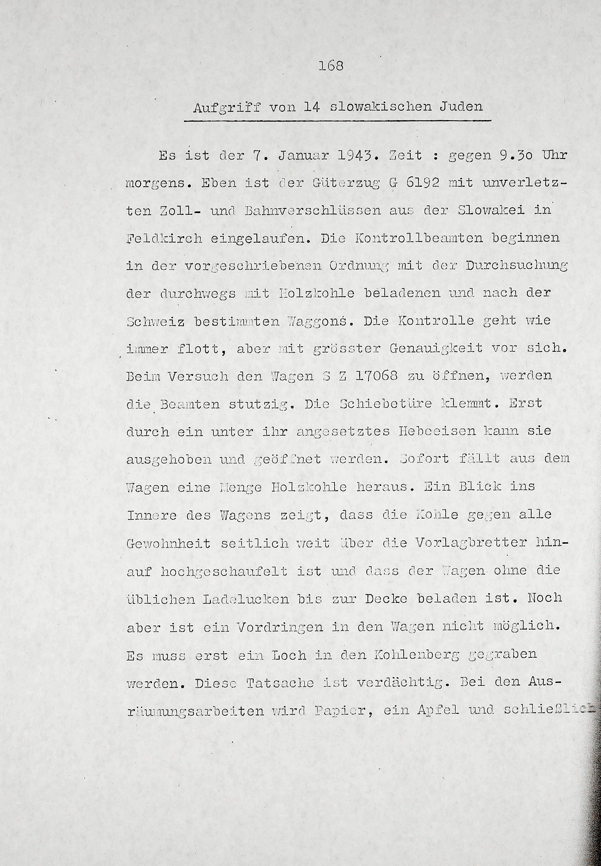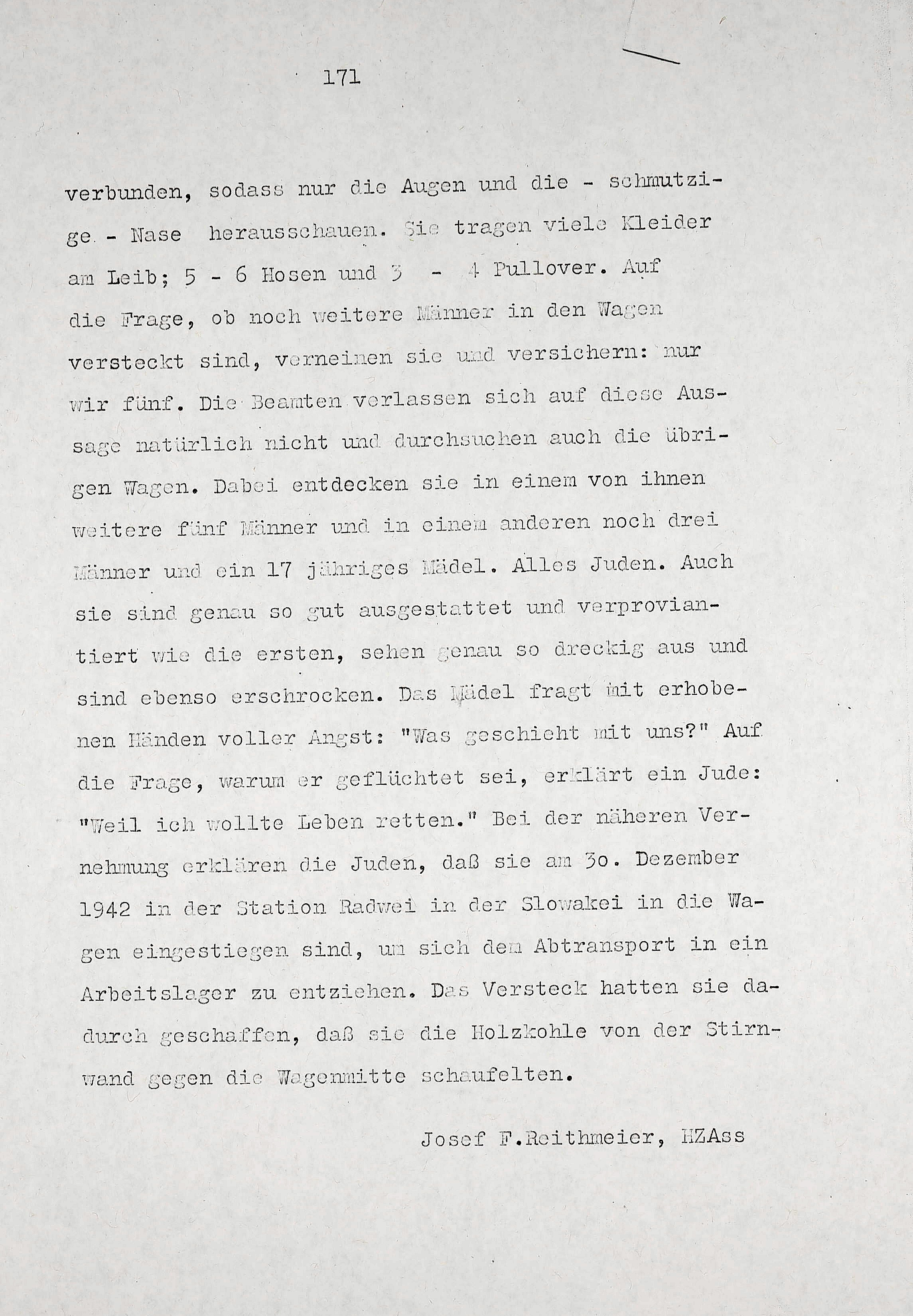 Weiter schreibt Reithmeyer in seinem Bericht: „Inzwischen haben sich die Flüchtlinge, von denen sich herausstellt, dass sie alle Juden sind, nach anfänglich großer Niedergeschlagenheit in ihr Geschick ergeben. Sie sehen abenteuerlich genug aus. Die Gesichter haben sie zum Schutz gegen Frost und Kälte mit Schals verbunden, sodass nur die Augen und die – schmutzige – Nase herausschauen. Sie tragen viele Kleider am Leib; 5-6 Hosen und 3-4 Pullover. Auf die Frage, ob noch weitere Männer in den Wagen versteckt sind, verneinen sie und versichern: nur wir fünf. Die Beamten verlassen sich auf diese Aussage natürlich nicht und durchsuchen auch die übrigen Wagen. Dabei entdecken sie in einem von ihnen weitere fünf Männer und in einem anderen noch drei Männer und ein 17jähriges Mädel. Alles Juden. ... Das Mädel fragt mit erhobenen Händen voller Angst: ‚Was geschieht mit uns?’ Auf die Frage, warum er geflüchtet sei, erklärt ein Jude: ‚Weil ich wollte Leben retten.’ Bei der näheren Vernehmung erklären die Juden, dass sie am 30. Dezember 1942 in der Slowakei in die Wagen eingestiegen sind, um sich dem Abtransport in ein Arbeitslager zu entziehen.“