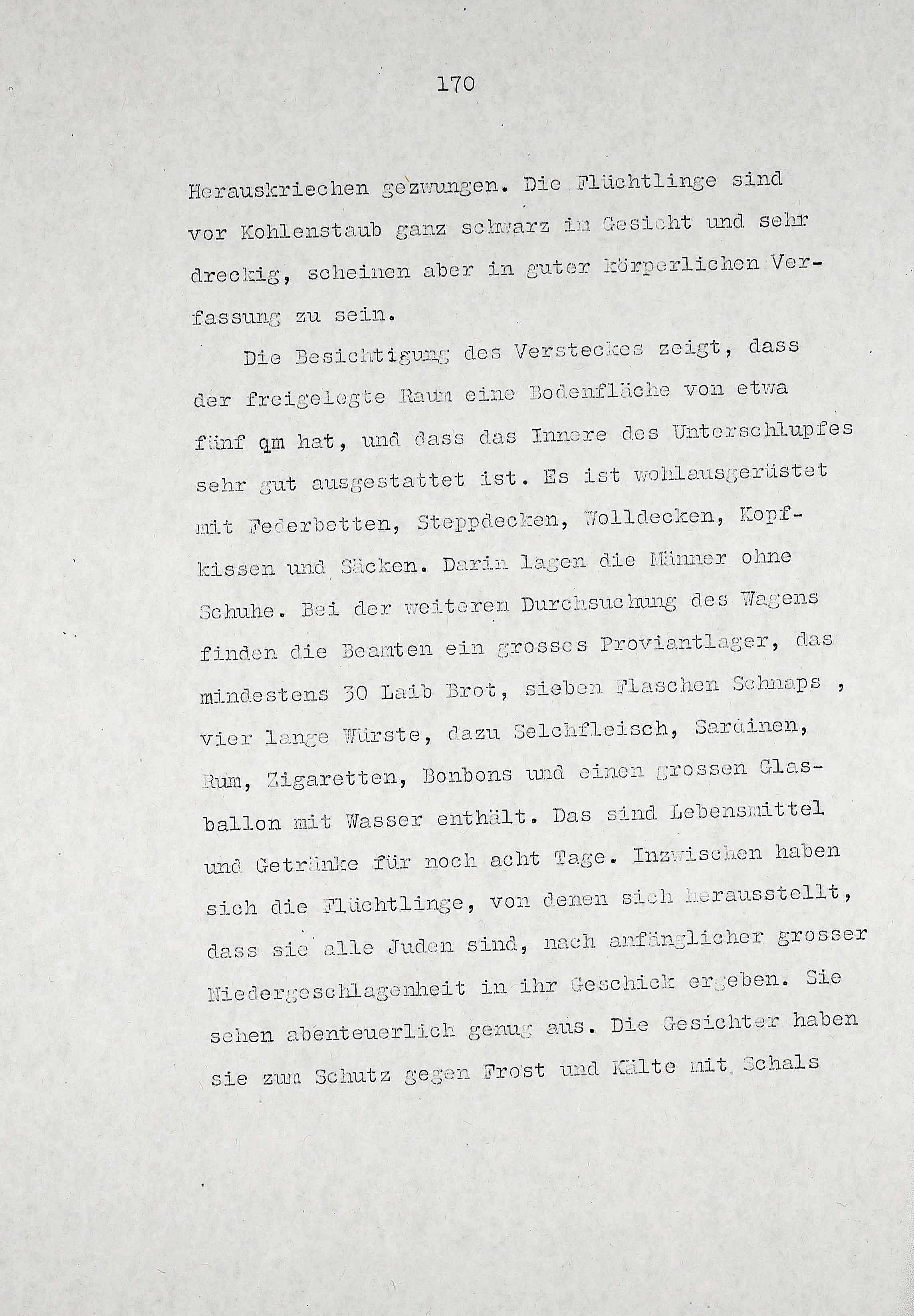 „Unterdessen graben sich die übrigen Beamten gegen die Stirnwand des Wagens vor und entdecken dort ein Loch, das fast bis auf den Boden des Wagens reicht. In diesem finden sie vier Flüchtlinge. Durch Entfernen weiterer Kohle schaffen sie einen Ausgang, dann fordern sie die Gefundenen auf, den Wagen zu verlassen. Diese Sträuben sich jedoch, werden aber bald mit vorgehaltener Pistole zum Herauskriechen gezwungen. Die Flüchtlinge sind vor Kohlenstaub ganz schwarz im Gesicht und dreckig, scheinen aber in guter körperlicher Verfassung zu sein.