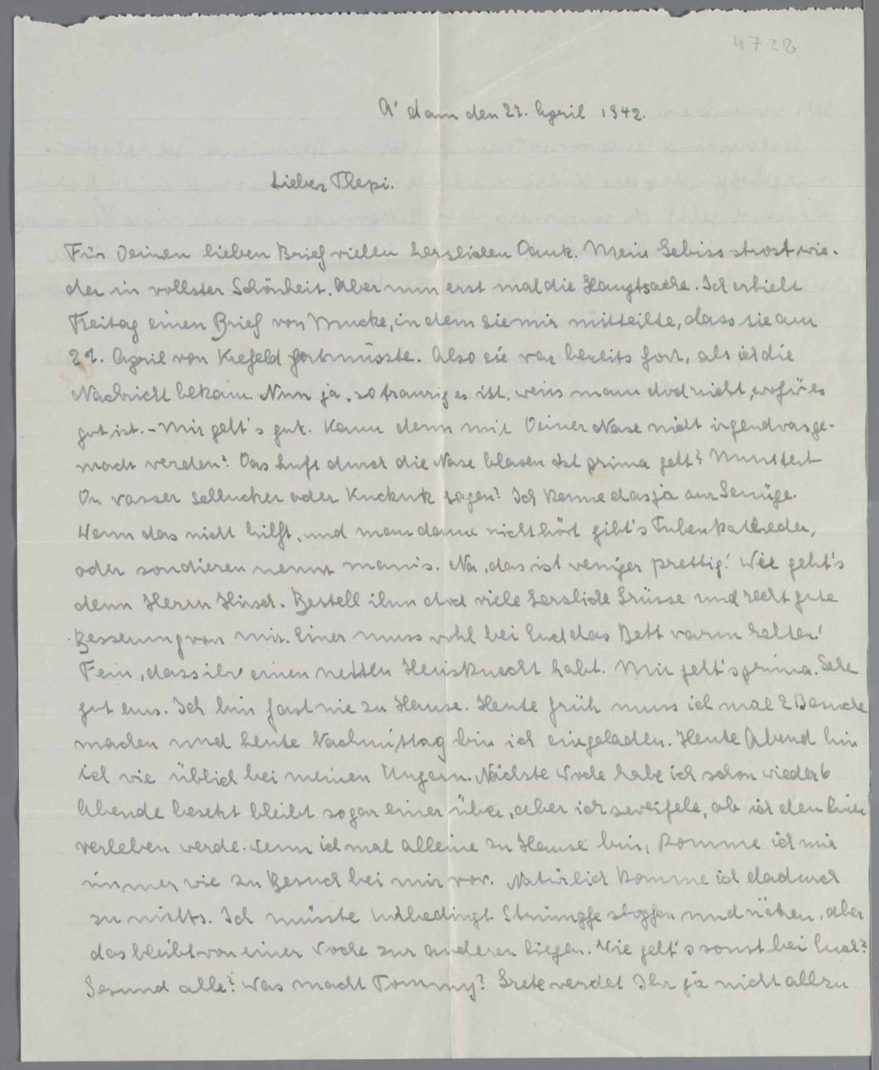 „Ich erhielt Freitag einen Brief von Mucke, in dem sie mitteilte, dass sie am 21. April von Krefeld fortmüsste. […] Nun ja, so traurig es ist, weiss man doch nicht, wofür es gut ist.“
