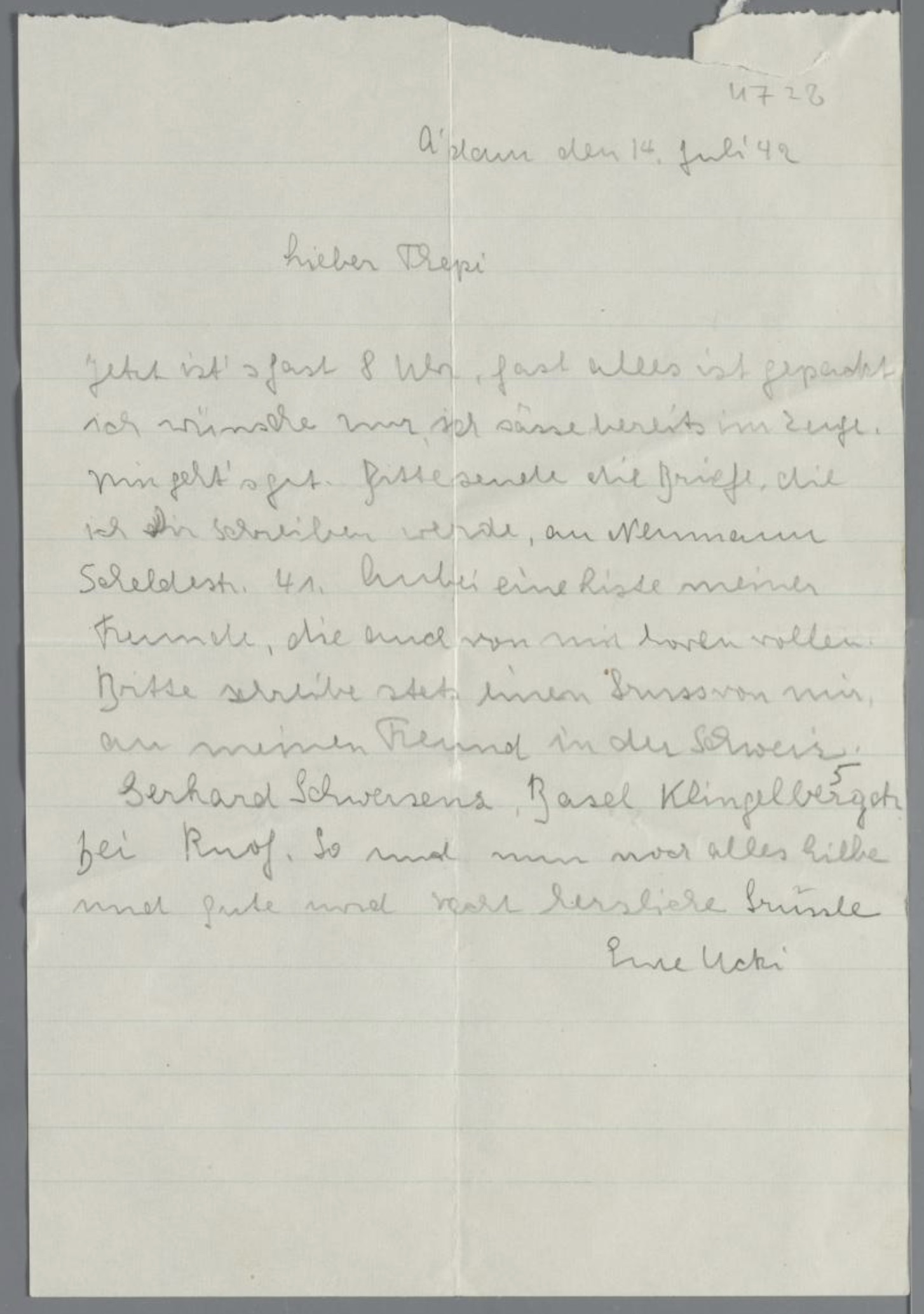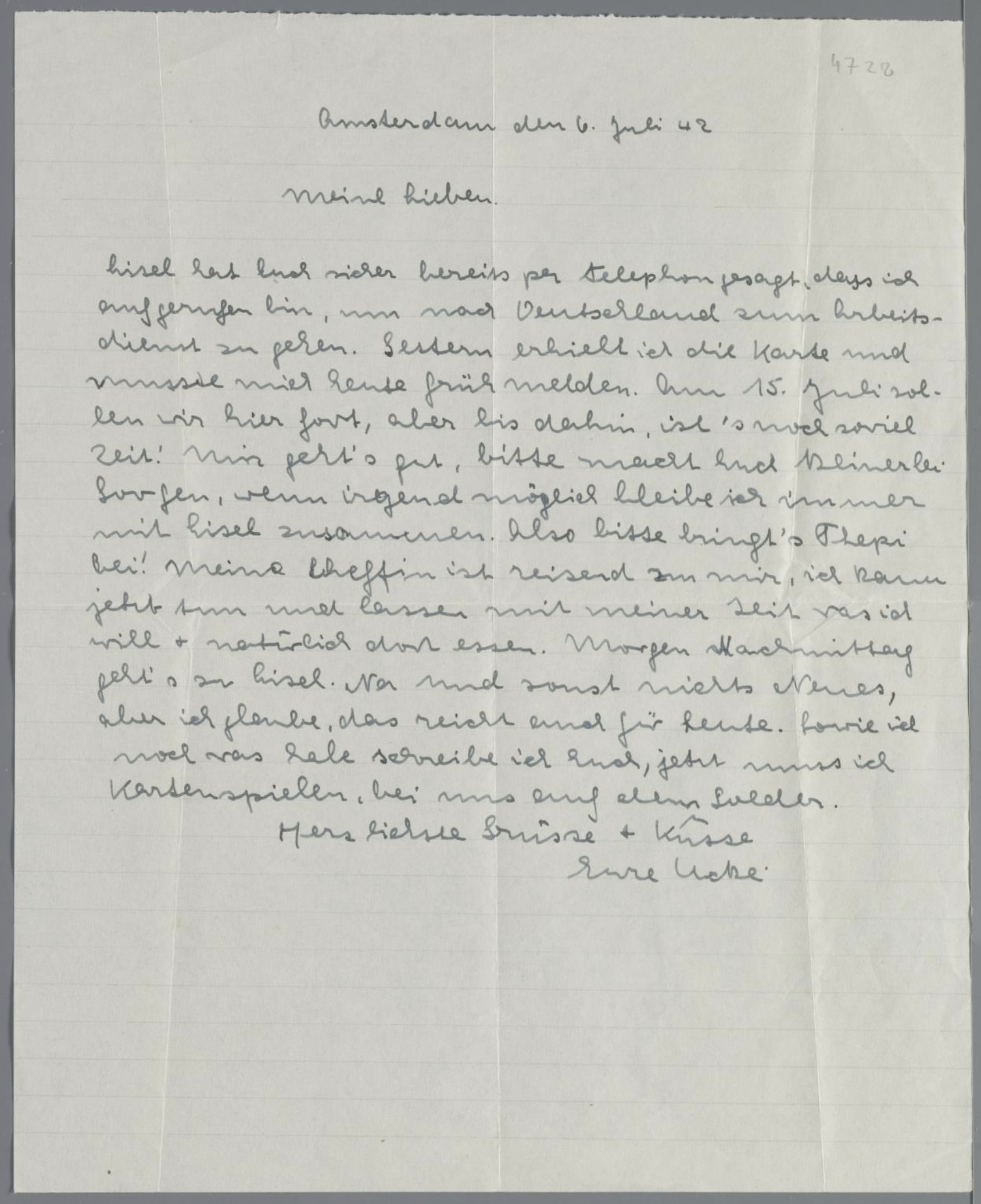 „Lisel hat Euch sicher bereits per Telephon gesagt, dass ich aufgerufen bin, nun nach Deutschland zum Arbeitsdienst zu gehen. […] Am 15. Juli sollen wir hier fort, aber bis dahin ist’s noch soviel Zeit. Mir geht’s gut, bitte macht Euch keinerlei Sorgen, wenn irgend möglich, bleibe ich immer mit Lisel zusammen. Also bitte bringt’s Thepi bei!“
