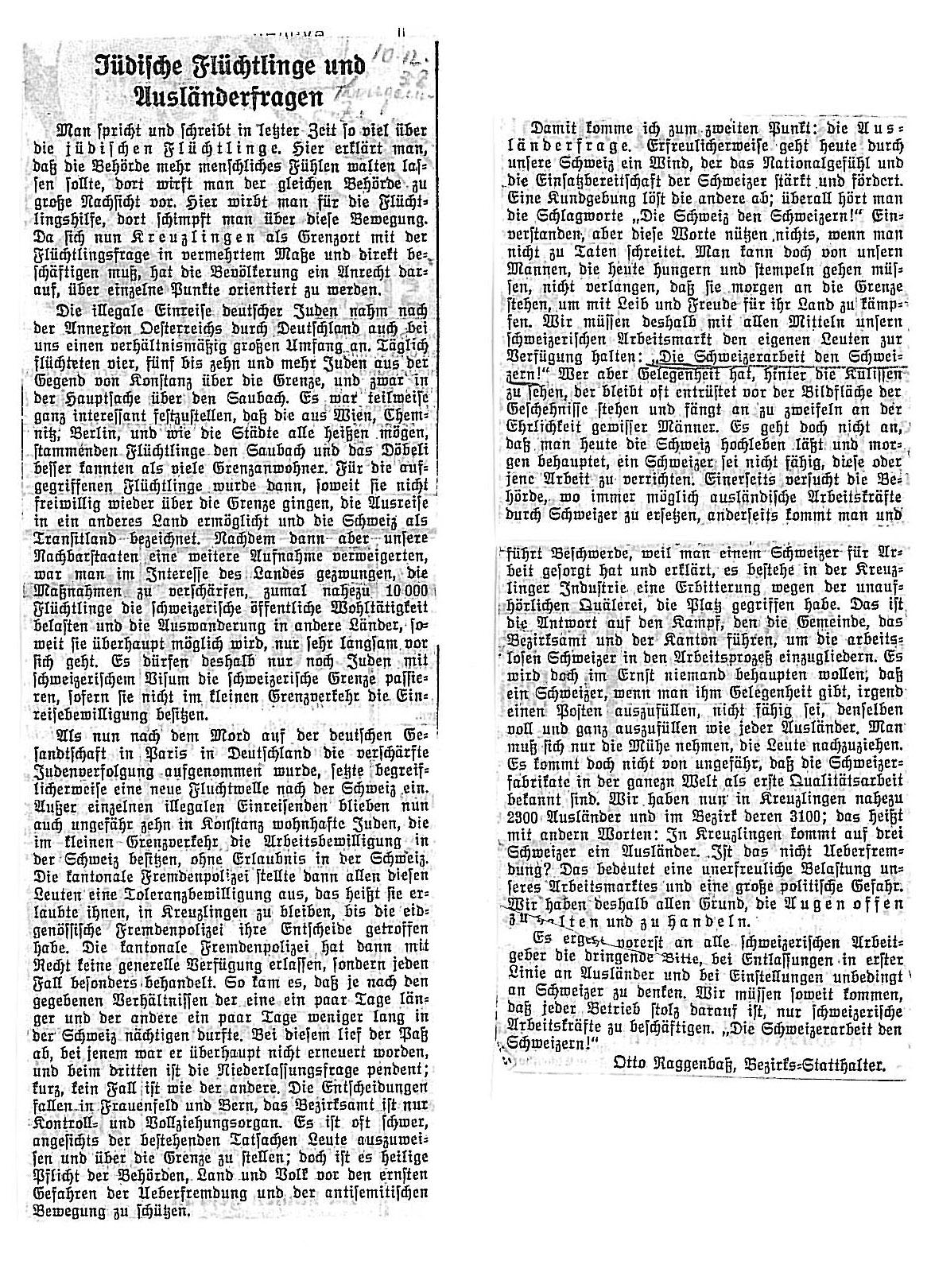 In der Thurgauer Zeitung beklagt Bezirks-Statthalter Otto Raggenbaß die Einreise illegaler jüdischer Flüchtlinge von Konstanz nach Kreuzlingen.