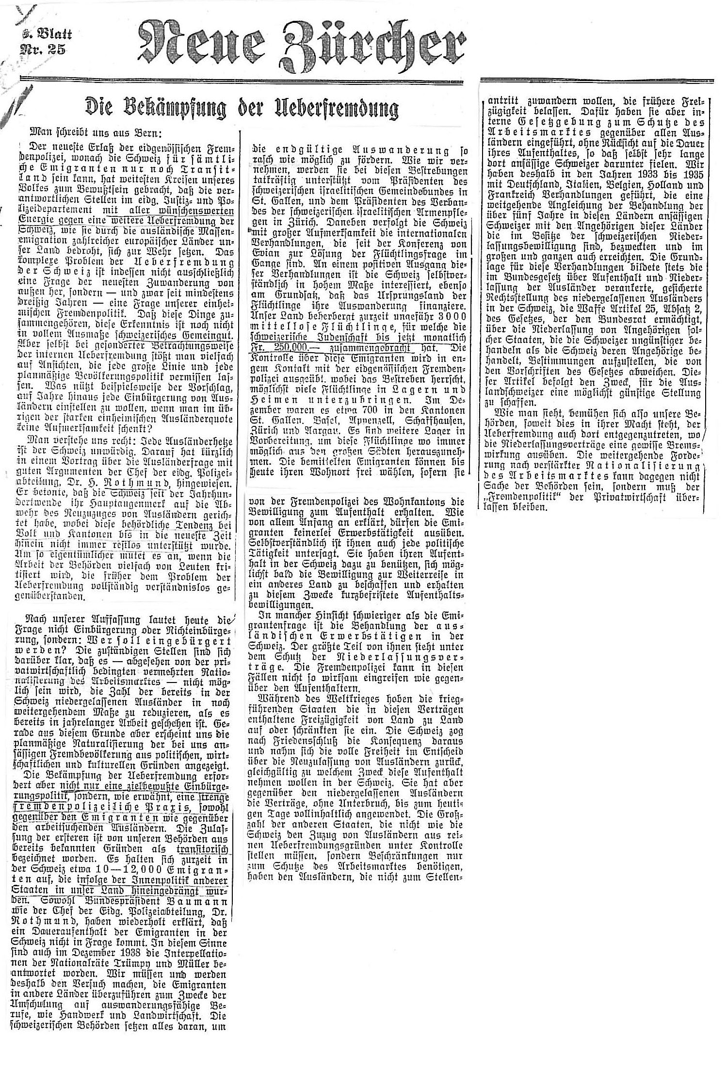 „Der neueste Erlaß der eidgenössischen Fremdenpolizei, wonach die Schweiz für sämtliche Emigranten nur noch Transitland sein kann, hat weitesten Kreisen unseres Volkes zum Bewusstsein gebracht, daß die verantwortlichen Stellen im eidg. Justiz- und Polizeidepartement mit aller wünschenswerten Energie gegen eine weitere Überfremdung der Schweiz, wie sie durch ausländische Massenemigration zahlreicher europäischer Länder unser Land bedroht, sich zur Wehr setzen. […] Die Bekämpfung der Überfremdung erfordert aber nicht nur eine zielbewusste Einbürgerungspolitik sondern […] eine strenge fremdenpolizeiliche Praxis, sowohl gegenüber den Emigranten wie gegenüber arbeitsuchenden Ausländern. […]“[3]
