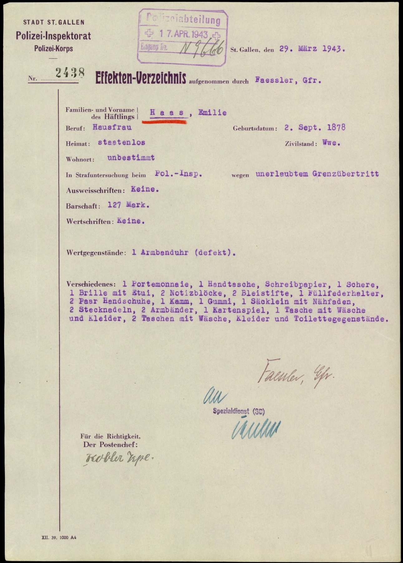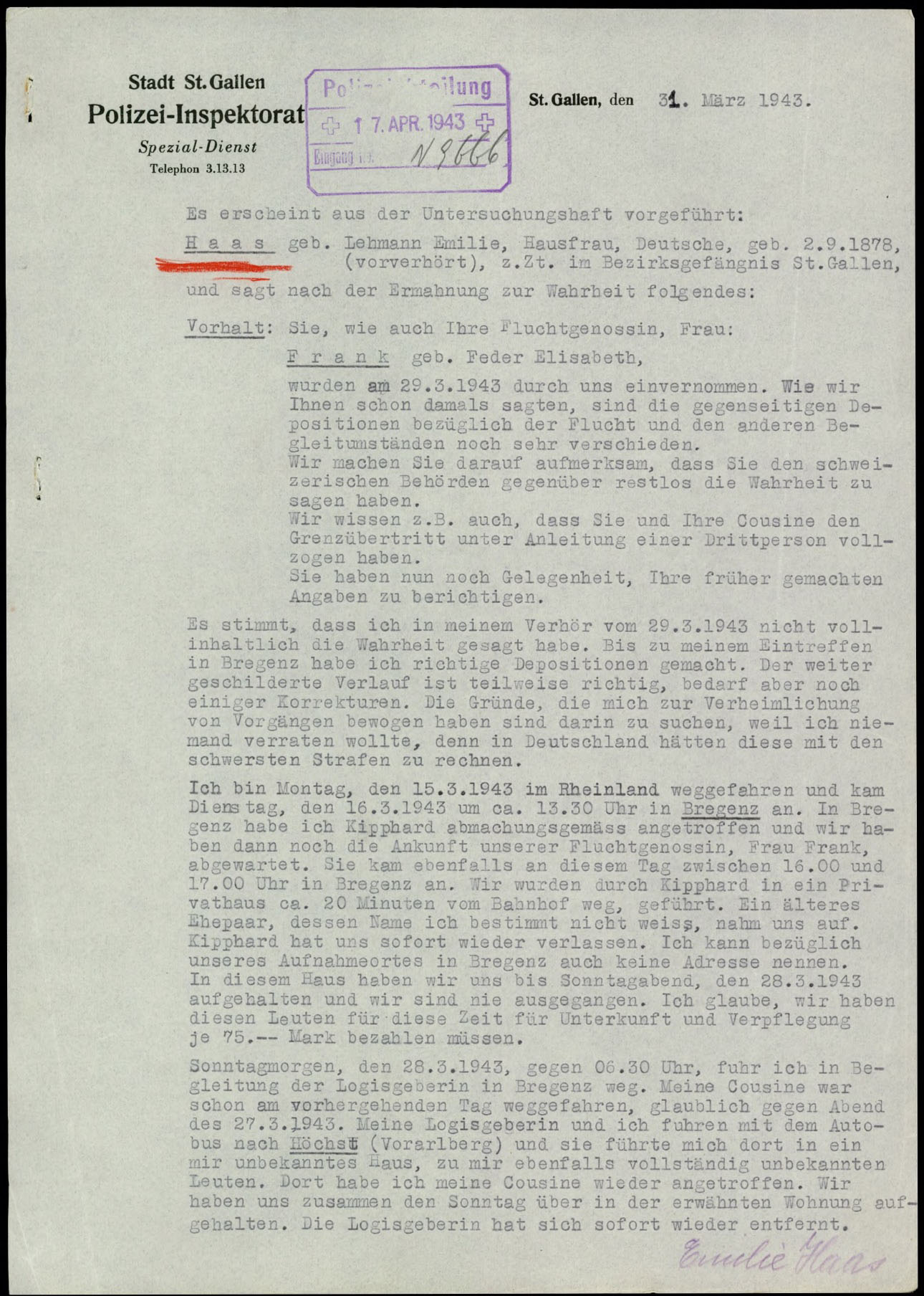[1] Verhörprotokoll Emilie Haas, St. Gallen, 29.3.1943, Dossier zu Emilie Haas; Schweizerisches Bundesarchiv, Bern