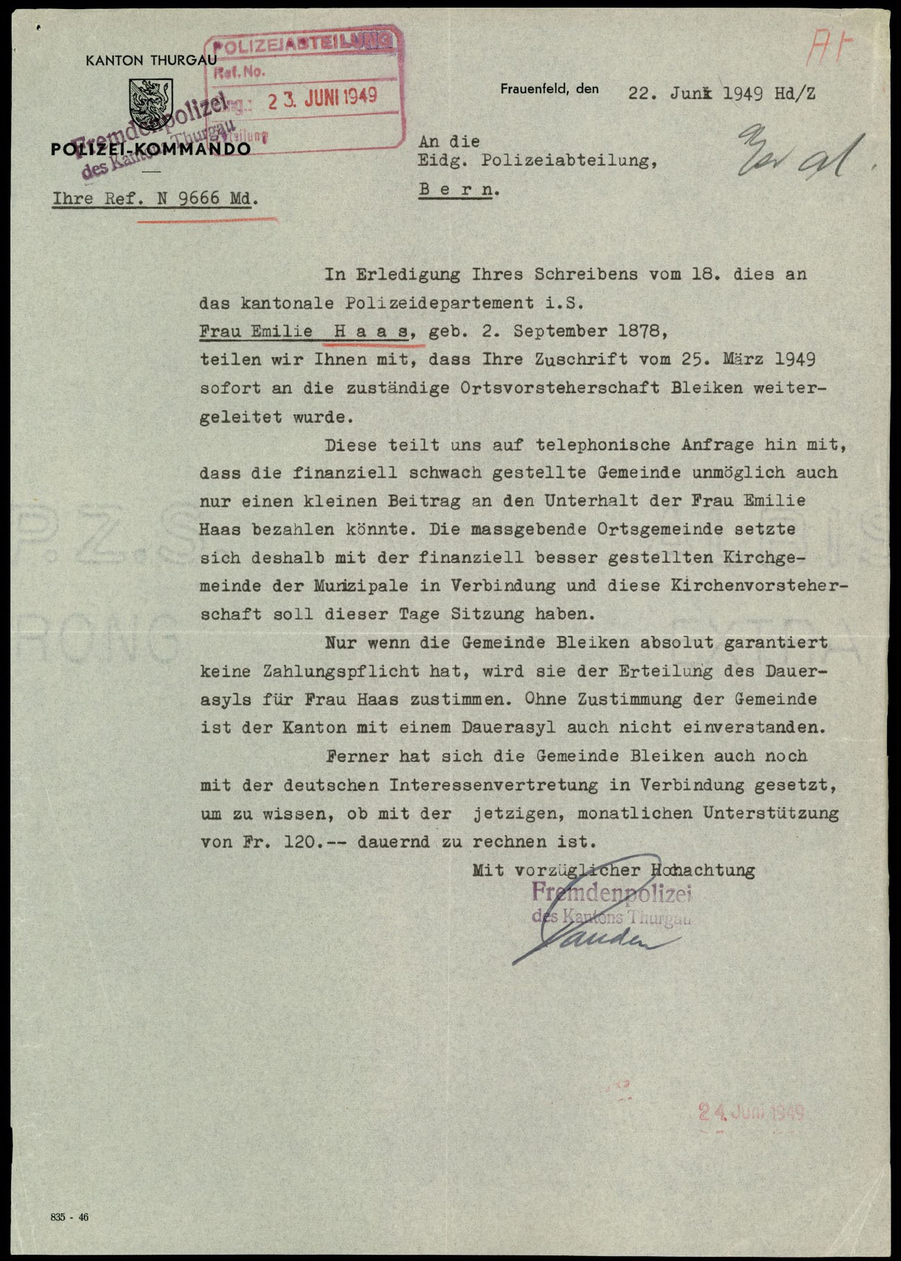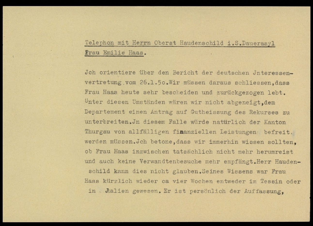 1950 wird Emilie Haas nach langem Papierkrieg ein Dauerasyl gewährt, auch wenn die Behörden im Thurgau noch 1952 mit dem Gedanken spielen, sie nach Deutschland abzuschieben. Von dort hat sie bis dahin eine Nothilfe erhalten. Eine Wiedergutmachung erhält sie nicht. Das Hilfswerk der Evangelischen Kirchen der Schweiz kümmert sich schließlich um sie, begleicht Arzt- und Spitalskosten. Mittlerweile ist Emilie Haas kurz vor ihrem 80. Lebensjahr. Am 17. April 1957 stirbt sie bei einem Arztbesuch in St. Gallen.