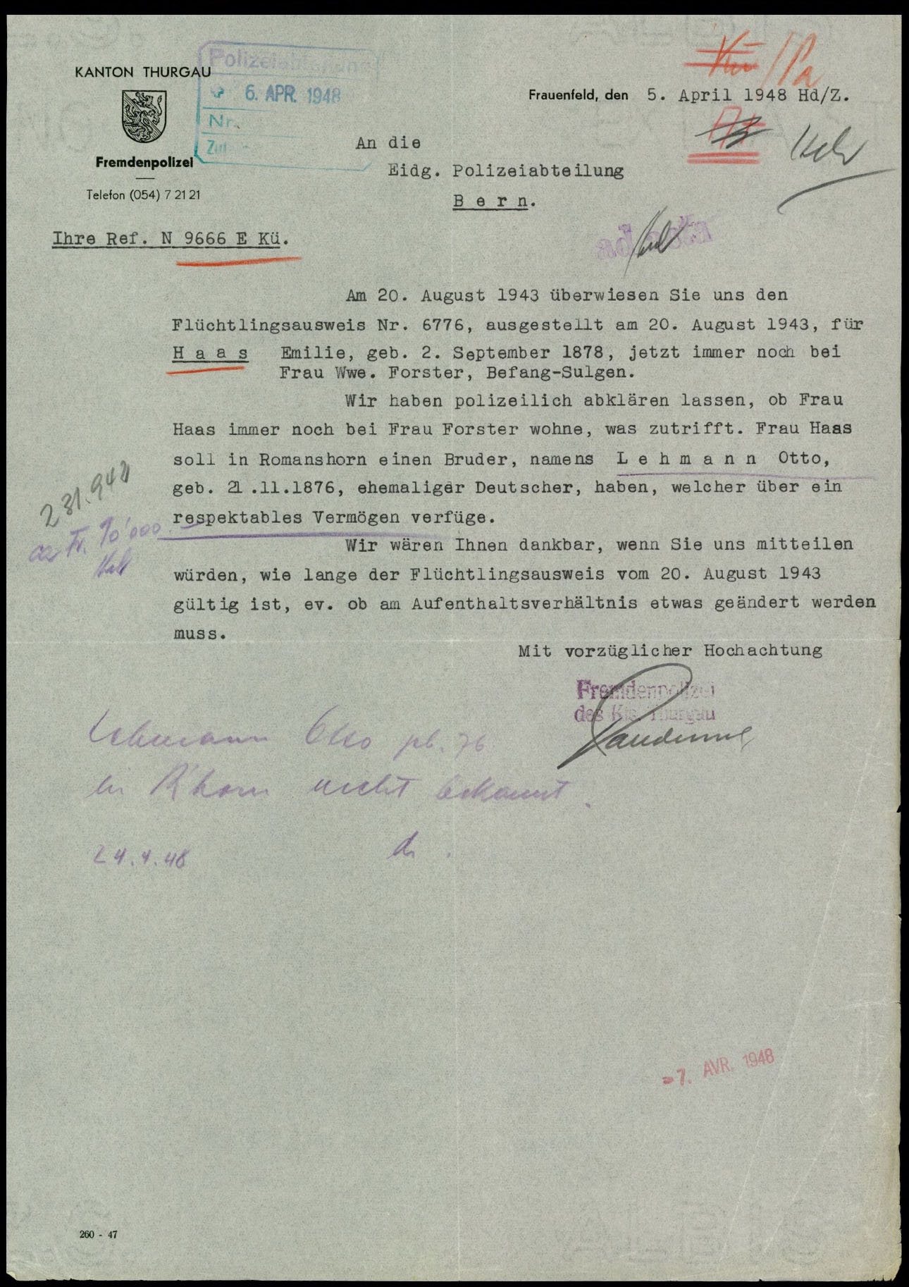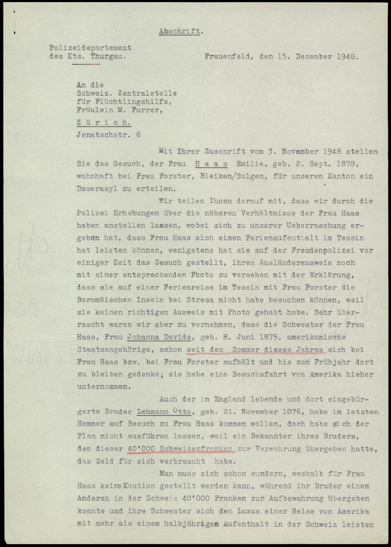 „Haas Emilie, Hausfrau, geb. 2.9.1878, in Deutschland, staatenlos, Wwe., (Tochter) des Levi und der Sarah geb. Lehmann, Wohnort unbestimmt. Barschaft: 127 Mark.
