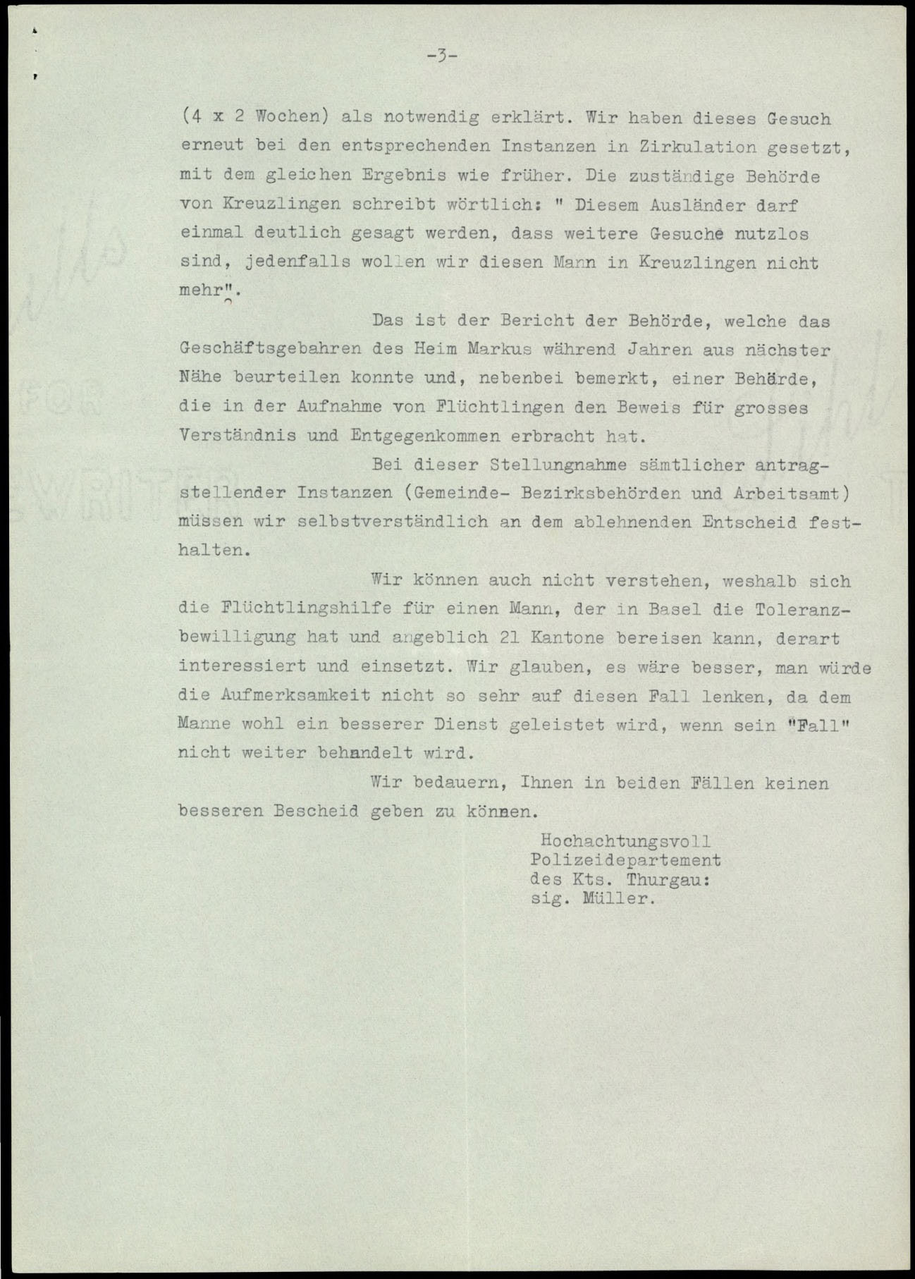„Am 29. März 1943, 01.00 Uhr, brachte ein Baumgartner Emil, wohnhaft Zürcherstrasse 438, die beiden vorgenannten Emigranten auf die Hauptwache. Er erklärte, sie seien auf dem Hauptbahnhof gestanden und nicht mehr weitergekommen. Er habe sie auf ihr Verlangen in ein Hotel bringen wollen, da aber beide nass und schmutzig waren, wurden sie nach ihrer Herkunft gefragt. Als es sich herausstellte, dass es sich um Emigranten handelte, welche schwarz über die Grenze gekommen waren, wurden sie von Baumgartner der Hauptwache zugeführt.