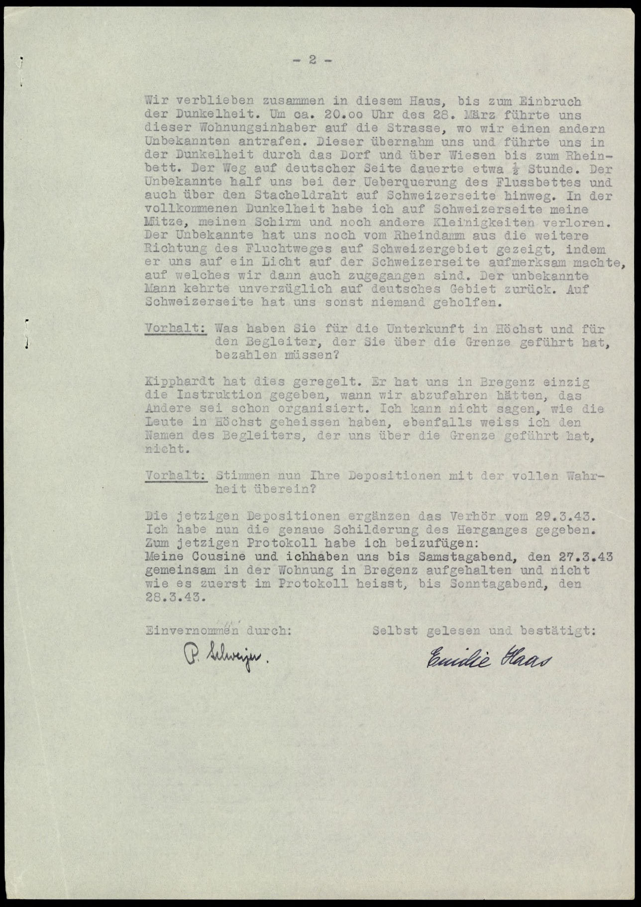 Auf Befragen erklärten die beiden Emigranten, sie hätten sich schön längere Zeit in Vorarlberg aufgehalten. Da sie befürchteten, verschleppt zu werden, seien sie am 28. März 1943, um ca. 20 Uhr, über den Rhein gewatet und so schwarz in die Schweiz gekommen.“